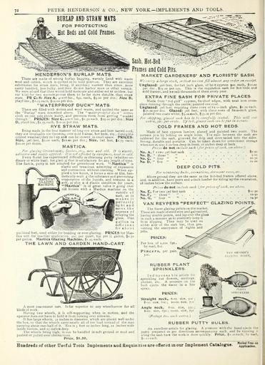 MAKE A MEME View Large Image Autumn bulbs catalogue (15831909033).jpg 72 <br> PETER HENDERSON CO NEW YORK ” IMPLEMENTS AND TOOLS <br> BURLAP AHD STRAW MATS <br> i - -' <br> HENDERSON'S BURLAP MATS <br> These are made of strong burlap bagging warmly lined with waste ...
