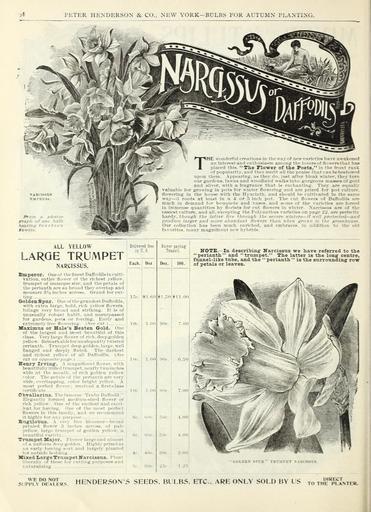 | Keywords: Autumn bulbs catalogue (16266025677).jpg 8 <br> PETER HENDERSON CO NEW YORK-BDLBS FOR AUTUMN PLANTING <br> - – <br> JiARCIsSnS <br> BMPBFSs <br> Prom a photo- <br> graph of onf hull <br> hearing foii rt pen <br> towers <br> iHE wdDflerfiil creatioiiH in tlie wny of newvnrii ties t 'c awakened <br> an intiTcst and i-ntliiisia ni anmng; tbe loversuf fli «»Tstliat has <br> laci-d this The Plo'wer of the Poets in tlip front rank <br> of popularity and tlK' \' merit all the praise t hat can l el ostowed <br> npon them Ajipearinjr as the v do just after bleak winter the v turn <br> our gardens lawns and woodland walks into p orj ous masses of jrold <br> and silver mth a fragranee that is emhantinjr The v arc equally <br> valuable for growing in pots for winter flowering ami are iirired for pot culture <br> flowering in the house with the Hyacinth and should lie cultivated In the same <br> way ” root-s at least in a 4- or 5 inch i ot The cut flowers of Daffodils are <br> mucli in demand for bouquets and vases and s ime of the varieties are forced <br> in immense quantities by florists for cut flowers in winter Narcissus are of the <br> eauiest culture and all excepting the Pol vanthus varieties on page 22 are perfectl v <br> hardy fftoo Zi The hilter live throup h tlie fevere winters ” if well proterled ” ani <br> produce larger and more ahiindant /lowers than when grown in the greenhouse <br> Our collection has lieen much enrichi'd and embraces in addition to the old <br> favorites many magnificent new h vlirids <br> ALL YELLOW <br> LARGE TRUMPET <br> NARCISSUS <br> Emperor Oneof thefinestDaffodilsinculti- <br> Tation entire flower of the richest vellow <br> trumpet of immense size and the i etals of <br> the perianth are so broad they overlap and <br> measure 3'/ inches across Grand for cut- <br> ting <br> Grolden Spnr Oneof thegrandest Daffodils <br> with extra l Trge bold rich yellow flowers <br> foliage ver v broail and striking It is of <br> tmusuall v robust habit and unsurjiaesed <br> for gardens pots or forcing Earl v and <br> extremel v fiiv flowering sv-e cut <br> Xazinius or Hale's Beaten Gold One <br> of the largest and most lie ititifnl of this <br> class Very large flower of rich deep golden <br> yellow Remarkable for an elegantl v twisted <br> perianth Trumiiet dc»'p golden large well <br> flanged and deejily fluted The darkest <br> and richest vellow of all Daffodils See <br> nut on opposite page <br> Senry Irving' a magnificent flower with <br> beautifully frilled trumpet nearl v two inches <br> wide at the mouth of rich golden vellow <br> color The i elals of the perianth are very <br> wide overlaiiping color bright yellow A <br> most perfect flower; nreived a first ia88 <br> certificate <br> Obvallarins Tliefamou t ˘ – Tenb v Daffodil <br> Elegantly formed Diediuui-slz -d flower of <br> rich yellow One of the earliest and excel- <br> lent for forcing One of the niost perfect <br> flowers in this faniil v an l we recommend <br> It highly for any iinrpone <br> Rngllobns \ very free bloomer ” broail <br> r etuled flower T inclicH across of jialc <br> yellow large Irnmpel of gohlen yellow a <br> heautiful v;ili 'l\' <br> Tnunpet Uajor riower largeand almost <br> 'it a uniform i i-«-p grdden Highly prized ns <br> in early for Ing s irt -iiirl birgi-ly ilaDted <br> lor outside b Iiliiig <br> Mixed ZiargeTrouipet Narcissus riant <br> bbernlly of these for cutting purposcfl and <br> iiHtnraiizing <br> Delivered free <br> in 0 S <br> Each <br> Ooz <br> 15c <br> 1 60 <br> 10c <br> 1 00 <br> 10c <br> 1 00 <br> loc <br> 1 no <br> Oi- iwii- <br> CC ; cue <br> 1 <br> 4c 4 <br> 1 <br> tr <br> o - <br> Buyer paying <br> Trinsil <br> Doz <br> 100 <br> NOTE ” In describing Narcissus we have referred to the <br> perianth and trumpet The latter is the long centre <br> funnel-like tube and the perianth is the surrounding row <br> of petals or leaves <br> ˘tiOLDES Jirilt TlllMrET NAiiiiBsra <br> WE DO NOT <br> SUPPLY nEAI R5 <br> HENDERSON'S SEEDS BILBS ETC ARE ONLY SOU BY L S <br> DIRECT <br> TO THE PLANTER <br> IJ 43899730 149965 78524 Page 18 Text http //www biodiversitylibrary org/page/43899730 1900 10 5962/bhl title 78524 Henry G Gilbert Nursery and Seed Trade Catalog Collection ; Peter Henderson Co NameFound Xazinius Biodiversity Heritage Library Autumn bulbs catalogue 1900 Garden Stories Bulbs Plants Catalogs Equipment and supplies Flowers Gardening Seeds Trade catalogues U S Department of Agriculture National Agricultural Library bhl page 43899730 dc identifier http //biodiversitylibrary org/page/43899730 Peter Henderson Co bhlGardenStories Narcissus BHLinbloom bulbs plants u s department of agriculture national agricultural library peter henderson co bhlgardenstories bhlinbloom Information field Flickr posted date ISOdate 2015-02-05 Check categories 2015 August 24 CC-BY-2 0 BioDivLibrary https //flickr com/photos/61021753 N02/16266025677 2015-08-24 23 57 11 cc-by-2 0 PD-old-70-1923 Autumn bulbs catalogue Photos uploaded from Flickr by Fæ using a script |
