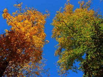Keywords: autumn colorful trees leaves yellow green sky blue