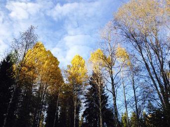 Keywords: autumn fall colors blue sky tree deciduous trees nature yellow white clouds dark bright