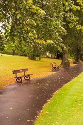 Keywords: autumn fall foliage bench landscape leaf leaves nature green outdoors park peaceful relax scenery season tree yellow