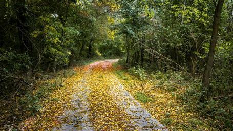 Keywords: autumn forest leaves nature trees path light foliage landscape yellow fallen leaves
