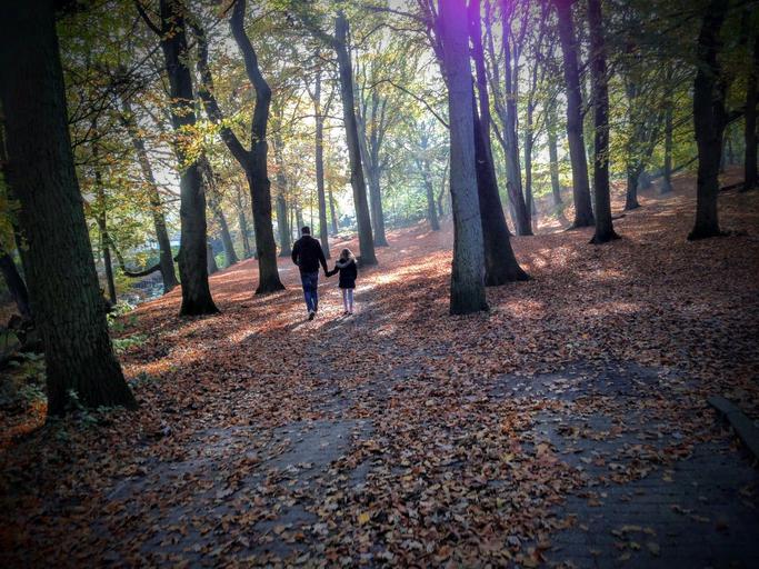 Keywords: autumn forest trees parent father and daughter happiness nature father and child outdoors fall leaves parents and children family outdoors together happy holland the netherlands duinrell