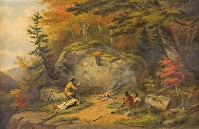 | Keywords: 'Autumn in West Canada, Chippeway Indians', oil painting by Cornelius Krieghoff, 1865.jpg title Autumn in West Canada Chippeway Indians http //www bonhams com/auctions/16913/lot/52/ Bonhams Toronto 2 Dez 2008 lot 52 creator Cornelius Krieghoff oil canvas cm 35 6 55 5 C Krieghoff 65 ~ signature/date lower right langswitch auf dem Spannrahmen on the stretcher object history Loetitia Paul nee Marshall 1835-1932 of Teignmouth and Barnstable Devon England <br/>Inherited by her nephew Commander Edward Tierney Marshall RN and then by descent to his daughter Joan Marshall Henderson in 1955 <br/>By family descent to the present owner in England 1865 PD-old-100-1923 DEFAULTSORT Krieghoff Cornelius; Native Americans; Bonhams 2008 Landscape paintings by Cornelius Krieghoff Paintings of Native Americans by Cornelius Krieghoff Ojibwa 1865 paintings Images from Bonhams |