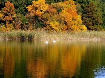 Keywords: autumn landscape lake swans trees leaf mirror feerie yellow