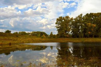 Keywords: autumn landscape pond lake beach trees forest sky clouds