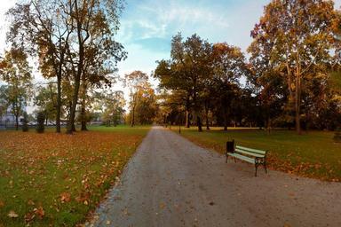 Keywords: autumn park tree foliage bench nature october leaf yellow sky walkway city skierniewice blue panorama the prospect of