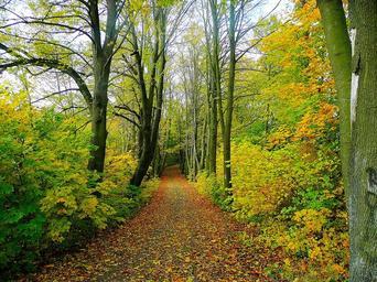 Keywords: forest lane walk sunset path oak way sunlight trail foliage vibrant park autumn vivid sunrise red yellow trees leaf deciduous bright avenue sunny light pathway woods dusk twilight season