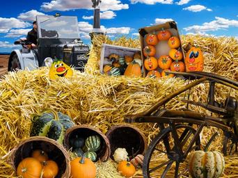 Keywords: autumn pumpkins harvest decorative squashes vegetables decoration food colorful field arable tractor lanz bike old basket face funny straw straw bales thanksgiving