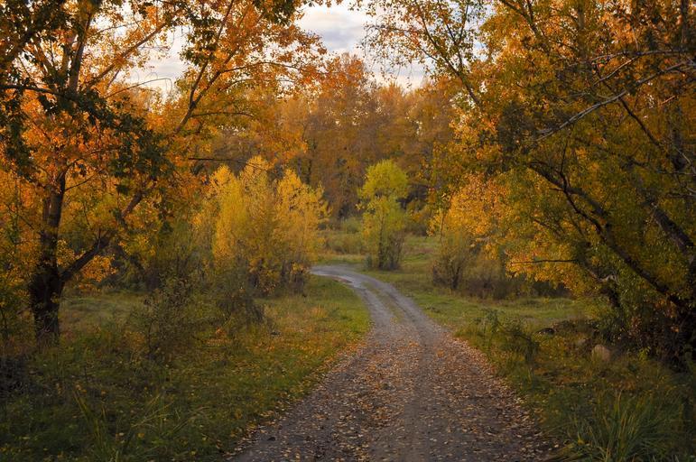 Keywords: autumn road forest trees nature landscape golden yellow bright fairy tale