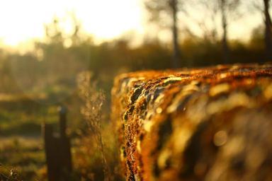 Keywords: autumn stone wall moss fall foliage evening light