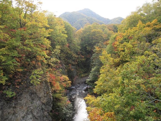 Keywords: autumnal leaves valley landscape rock japan jozankei fall forest autumn leaf river mountain