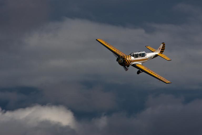 Keywords: aviation plane two seater stunt yellow white clouds sky propeller stowe maries airfield
