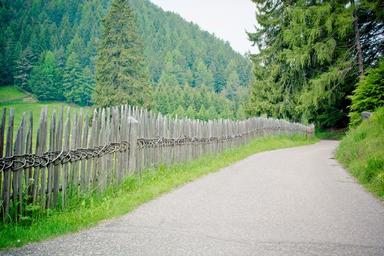 Keywords: away fence wood fence paling limit alpine landscape hiking hike forest asphalt garden fence trail dolomites nature