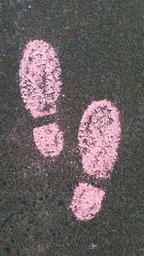 Keywords: away shoes steps pink asphalt road walk go pavement on foot go for a walk chalk art children flashlights road circles paint