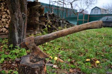 Keywords: axe dacha autumn firewood closeup yard