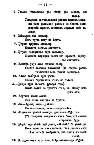 | Keywords: Azerbaijani proverbs 62.jpg en Page with Azerbaijani proverbs written by Alexander Kalashev from the words of Hasan Kerimov inhabitant of Yelizavetpol town nowadays Ganja Сбо ник мате иалов для описания местностей и племен Кавказа Выпуск восемнадцатый Отдел II Ст 62 Azerbaijani proverbs written by Alexander Kalashev from the words of Hasan Kerimov 1894 PD-old Azerbaijani proverbs Azerbaijani manuscripts | ||||