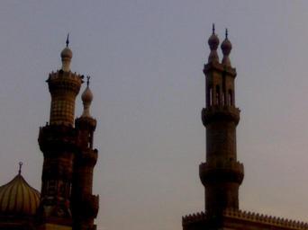 Keywords: Azharwithsunset.JPG مآذن الأزهر في الغروب Own 2008 الحسيني القاهري Al-Azhar Mosque