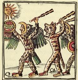 | Keywords: Aztec Warriors (Florentine Codex).jpg en Aztec Warriors Eagle Warrior at the left and Jaguar Warrior at the right brandishing a macuahuitl a wooden club with sharp obsidian blades http //www fieldmuseum org/museum_info/press/images/aztecworld4_lg jpg The Field Museum Library PD-Art Aztec culture Florentine Codex Jaguar warrior Eagle warrior Macuahuitl Aztec costumes |