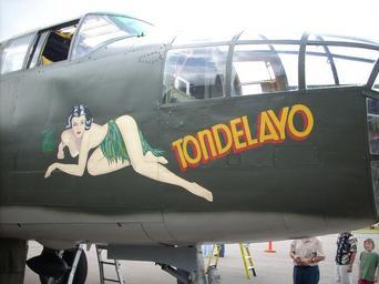 | Keywords: B-25 Mitchell nose art Tondelayo.jpg Detail of the nose art on a B-25 Mitchell aircraft at the Collings Foundation Airshow Aircraft details B-25J-15NC c/n 108-32207 44-28932 N3476G ex-TB-25J ex-TB-25N BD-932 ex-air tanker 6 Tondelayo Collings Foundation New Smyrna Beach FL A own Zwanee3 Photo by Zach Swanson Zwanee3 Zwanee3 original upload log page en wikipedia B-25_Mitchell_nose_art_Tondelayo jpg '1' Upload date User Bytes Dimensions Comment - nowrap 2007-12-10 22 59 03 nowrap Zwanee3 nowrap 1264981 nowrap 2560×1920 <small><nowiki>Zach Swanson Collings Foundation Airshow</nowiki></small> Nose art on B-25 Mitchell Tondelayo B-25 Mitchell |