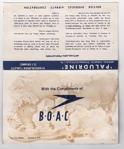 Keywords: boac drug medicine malaria ant-malaria antmalaria prophylactic customer service customerservice aviation airline seat back contents seatbackcontents airliner vintage advertising slogan boac takes good care of you boactakesgoodcareofyou british british overseas airways corporation britishoverseasairwayscorporation ephemera memorabilia biography autobiography drugs proguanil placebo hydrochloride In 1956, when I was 12 years old, I flew quite often alone. I had a small paper label on string around my neck which read, "Unaccompanied Minor". And indeed I was unaccompanied, since more often than not other passenger sat beside me and only other children, if any, would speak with me. I kept anything of interest that was in the seatback pocket in front of me. For example, this packet of "Paludrine" tablets. One packet was in each of the seatbacks of a BOAC DC4-M "Argonaut" flight which terminated in Rangoon, Burma. I was of sufficient intelligence to know that one does not chew pills as if they were complimentary candy. Even so, though, as a grown-up I now see that the dosage (0.1mg) is so low that they are more a "Takes Good Care of You" promotion than a drug. In 1956, when I was 12 years old, I flew quite often alone. I had a small paper label on string around my neck which read, "Unaccompanied Minor". And indeed I was unaccompanied, since more often than not other passenger sat beside me and only other children, if any, would speak with me. I kept anything of interest that was in the seatback pocket in front of me. For example, this packet of "Paludrine" tablets. One packet was in each of the seatbacks of a BOAC DC4-M "Argonaut" flight which terminated in Rangoon, Burma. I was of sufficient intelligence to know that one does not chew pills as if they were complimentary candy. Even so, though, as a grown-up I now see that the dosage (0.1mg) is so low that they are more a "Takes Good Care of You" promotion than a drug. |