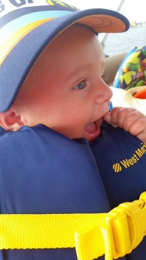 Keywords: baby boy boat life jacket ocean pontoon cute