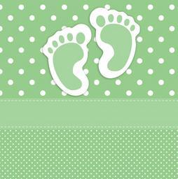 Keywords: baby footprints feet footsteps green white polka dots dots spots card template scrapbooking art illustration birth new baby announcement cute