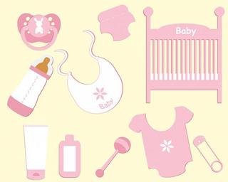 Keywords: baby girl accessories elements bib soother pacifier dummy crib cot bottle milk bottle feeding bottle lotion cream pin safety pin rattle pink onesie top vest art