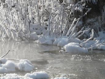 Keywords: bach bank embankment water running winter hoarfrost snow deep snow wintry