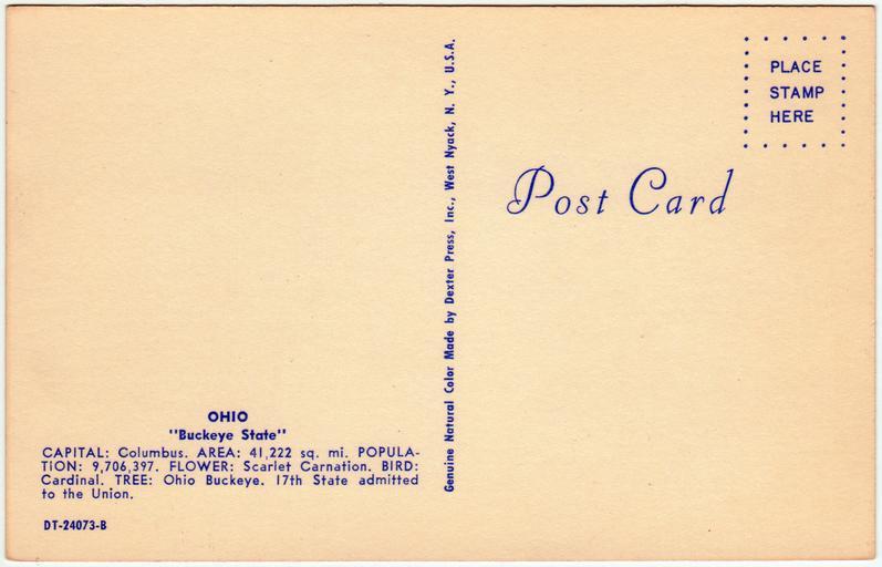Keywords: postcard postcards ohio unused divided back dividedback date unknown dateunknown unknown date unknowndate dexter press dexterpress Description on front of card: Greetings from Ohio "The Buckeye State" Description on back of card: OHIO "Buckeye State" CAPITAL: Columbus. AREA: 41,222 sq. mi. POPULATION: 9,706,397. FLOWER: Scarlet Carnation. BIRD: Cardinal. TREE: Ohio Buckeye. 17th State admitted. Made by: Dexter Press, Inc., West Nyack, N.Y. / Genuine Natural Color postcard Unused. Publisher Note: Thomas A. Dexter was the inventor of gang printing. His company printed a wide variety of postcard subjects as linens and photochromes in New York from 1934-1980. The photochromes printed by Dexter have the the words "Genuine Natural Color" despite going through a variety of phases. The company's early photochromes went under the name "Dextone" and were often flat and somewhat dull in appearance. The company's optical blending techniques improved producing richer and more varied colors over time. The company merged with MWM Color Press in 1980 to become MWM Dexter, and they moved to Aurora, Missouri. Source: www.metropostcard.com/publishersd.html Description on front of card: Greetings from Ohio "The Buckeye State" Description on back of card: OHIO "Buckeye State" CAPITAL: Columbus. AREA: 41,222 sq. mi. POPULATION: 9,706,397. FLOWER: Scarlet Carnation. BIRD: Cardinal. TREE: Ohio Buckeye. 17th State admitted. Made by: Dexter Press, Inc., West Nyack, N.Y. / Genuine Natural Color postcard Unused. Publisher Note: Thomas A. Dexter was the inventor of gang printing. His company printed a wide variety of postcard subjects as linens and photochromes in New York from 1934-1980. The photochromes printed by Dexter have the the words "Genuine Natural Color" despite going through a variety of phases. The company's early photochromes went under the name "Dextone" and were often flat and somewhat dull in appearance. The company's optical blending techniques improved producing richer and more varied colors over time. The company merged with MWM Color Press in 1980 to become MWM Dexter, and they moved to Aurora, Missouri. Source: www.metropostcard.com/publishersd.html |