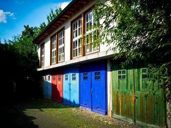 Keywords: backyard home housewife colorful architecture blue red green garage door building