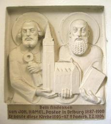 | Keywords: Bad Driburg St. Peter und Paul Joh. Hamel.jpg In die Mauer eingelassenes Gedenkrelief in der katholischen Pfarrkirche St Peter und Paul in der Innenstadt von Bad Driburg Deutschland Inschrift Dem Andenken von JOH HAMEL Pastor in Driburg 1887 “1900 Er baute diese Kirche 1895 “97 Paderb 7 7 1904 own 2004 bdk bdk St Peter und Paul Bad Driburg 2004 in Bad Driburg Reliefs in North Rhine-Westphalia Wall mounted church monuments in North Rhine-Westphalia 1904 church monuments in Germany Reliefs of keys |