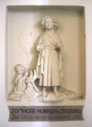 | Keywords: Bad Driburg St. Peter und Paul Heinrich von Driburg.jpg In die Mauer eingelassener Epitaphrest in der katholischen Pfarrkirche St Peter und Paul in der Innenstadt von Bad Driburg Deutschland Inschrift DOMHERR HEINRICH v DRIBURG Der Letzte seines Geschlechts 1463 Die beschÃĪdigte Grabplatte wurde 1796 aus dem Kreuzgang des Paderborner Doms ausgebrochen der erhaltene Teilstein nach Driburg gebracht und dort in der Pfarrkirche vermauert Der Domherr mit dem Familienwappen ist unten links dargestellt; die rechte Figur wird als Jesus Christus gedeutet own 2004 bdk bdk St Peter und Paul Bad Driburg 2004 in Bad Driburg Wall mounted church monuments in North Rhine-Westphalia Gothic church monuments in North Rhine-Westphalia 1463 church monuments in Germany |