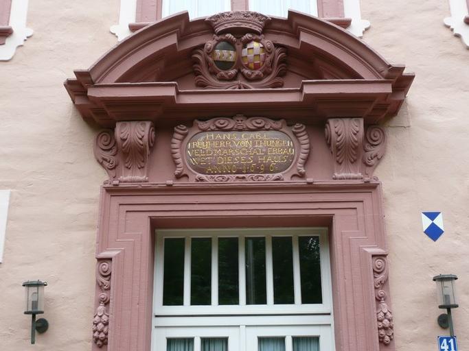 | Keywords: Bad Ems Vier Tuerme.JPG Karlsburg called Vier Tuerme Built in 1606 by Hans Carl von Thüringen Architect Johann Christoph Sebastiani ; 1809/10 finished Portal detail with court of arms of H C von Thüringen Reliefs in Bad Ems Reliefs of coats of arms in Rhein-Lahn-Kreis |