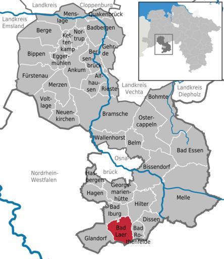 | Keywords: Bad Laer in OS.svg DeLocMaps Bad Laer Landkreis Osnabrück District of Osnabrück Osnabrück district L'arrondissement d'Osnabrück Arrondissement d'Osnabrück Niedersachsen Lower Saxony Basse-Saxe TUBS/Translation own Adobe Illustrator based on File Lower Saxony location map svg NordNordWest http //www landkreis-osnabrueck de/pics/medien/1_1221811658/Zwei_Wege_Strategie pdf Landkreis Osnabrück Die 2-Wege-Strategie im Landkreis Osnabrück File Locator map OS in Lower Saxony svg TUBS 2009-06-20 TUBS TUBS GFDL cc-by-3 0 2 5 2 0 1 0 cc-by-sa-3 0 2 5 2 0 1 0 TUBS/Credits Locator maps of municipalities in Landkreis Osnabrück Bad Laer |