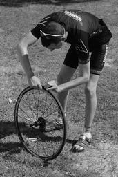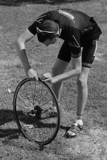 Keywords: bad luck professional road bicycle racer flat tire repair wheel bicycle wheel