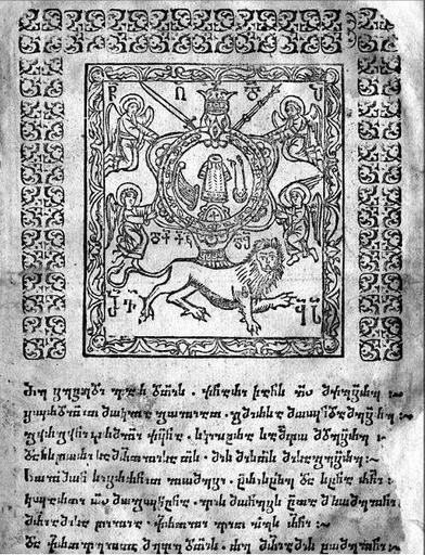 | Keywords: Bagrationi COA (1713).JPG en One of the earliest coat of arms of the Bagrationi dynasty with a rhymed explanation of its symbols A page from the Liturgies printed in Tbilisi in 1713 under the auspices of Vakhtang VI of Kartli საქართველ ს პარლამე ტის ერ ვ ული ბიბლი თეკა ვახტა გ -ის სტამბის გამ ცემები 1709-1722 შემდგ დალი მაჩაიძე თბ 2009 Author 1713 80px 80px 80px PD-old-100 1713 in Tbilisi Vakhtang VI Bagrationi dynasty coats of arms Nuskhuri letters | ||||