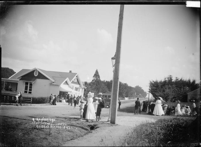 Keywords: blackandwhite monochrome outdoor black and white View of N Bainbridge's shop on Alison's Corner (now known as the Mon Desir Corner) with people sitting under the canvas awning at the front of the shop. People are standing on the opposite side of the road and a horse-drawn bus is waiting nearby. The shop appears to be part of a large single storey wooden house. Photograph taken by William Price ca 1908. Inscriptions: Inscribed - Photographer's title on negative -bottom left: N.Bainbridge. Fruit & Confectionary. Alison's Corner. 2117.. Quantity: 1 b&w original negative(s). Physical Description: Dry plate glass negative 4.5 x 6.5 inches Bainbridge's Fruit and Confectionery Shop, Alison's Corner, Takapuna. Price, William Archer, 1866-1948 :Collection of post card negatives. Ref: 1/2-000434-G. Alexander Turnbull Library, Wellington, New Zealand. natlib.govt.nz/records/22458675 View of N Bainbridge's shop on Alison's Corner (now known as the Mon Desir Corner) with people sitting under the canvas awning at the front of the shop. People are standing on the opposite side of the road and a horse-drawn bus is waiting nearby. The shop appears to be part of a large single storey wooden house. Photograph taken by William Price ca 1908. Inscriptions: Inscribed - Photographer's title on negative -bottom left: N.Bainbridge. Fruit & Confectionary. Alison's Corner. 2117.. Quantity: 1 b&w original negative(s). Physical Description: Dry plate glass negative 4.5 x 6.5 inches Bainbridge's Fruit and Confectionery Shop, Alison's Corner, Takapuna. Price, William Archer, 1866-1948 :Collection of post card negatives. Ref: 1/2-000434-G. Alexander Turnbull Library, Wellington, New Zealand. natlib.govt.nz/records/22458675