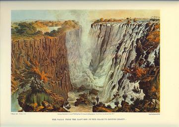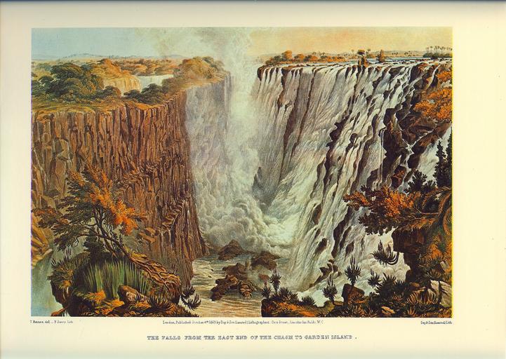 | Keywords: Baines Falls from the East col print.jpg Title THE FALLS FROM THE EAST END OF THE CHASM TO GARDEN ISLAND <br> Additional text T Baines del_F Jones Lith London Published October 4th 1865 by Day Son Limited Lithographers Gate Street Lincoln's Inn Fields WC Day Son Limited Lith <br> Content Victoria Falls with trees and probably aloes scan from modern copy of colour print original publication 1865 uploaded to Commons 2006-09-21 Creator Thomas Baines as below See also Image Baines Herd of Buffaloes jpg Image Baines Falls by Sunrise col print jpg Image Baines4 jpg Image Baines Gt Western Fall col print jpg Image Baines Zanjueelah jpg PD-old Thomas Baines Victoria Falls in art 1865 |