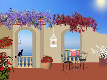 Keywords: balcony outside flowers table tranquility seaside red flower pots veranda black cat nature cage bird flower boxes chairs ocean sea hibiscus arches railing sun blue sky