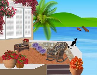 Keywords: balcony patio summer chairs flowers armchairs veranda plants flowering nature rattan furniture relaxation summer flowers flower pots windows palm black cat