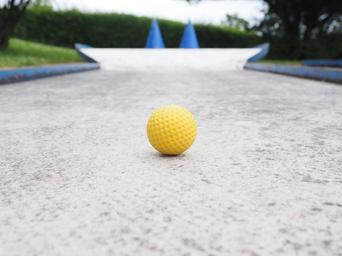 Keywords: ball mini golf ball yellow checkered ball guide miniature golf minigolf plant ground golf skill game precision sport train minigolf ground obstacles eternit track putten putting rubber ball