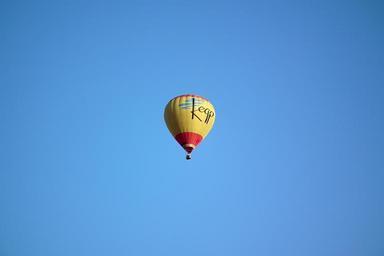 Keywords: balloon journey sky fly transport yellow blue day bright blue sky summer sports competition hobby passion vacation