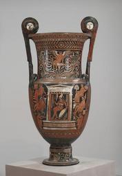 | Keywords: Baltimore Painter - Volute Krater - Walters 4886 - Side B.jpg When an ancient artist's name is not known he is often designated by the location of his most prominent work Thus the artist of this vase is known as the Baltimore Painter taking his name from this piece More than 1 500 vases are attributed to this artist who worked in Apulia South Italy The flowery vines elaborately patterned drapery extensive use of foreshortening the technique of drawing objects from the front and creating an illusion of depth and added color are typical of Apulian works This vessel served as a funerary marker On the front the messenger-god Hermes who also guided the dead to the underworld waits as a woman representing the deceased prepares for her journey there The figures on either side may represent other dead souls This type of krater a vessel for mixing water and wine is known as a volute krater because of the spiral scroll-like volute shape of the handles Though generally used for dispensing wine at parties the funerary scenes depicted on the sides of the vessel indicate that it was not created for drinking parties but for use as a burial marker The scenes on the vase represent the underworld The world of the dead was referred to as the house of Hades the domain of that god On the backside is a warrior clothed in Campanian southern Italy clothing seated in a naiskos or shrine ca 320 310 BC Classical terracotta cm 114 60 46 5 accession number 48 86 30814 Joseph Brummer Henry Walters city Baltimore Walters Art Museum Henry Walters Acquired by Henry Walters 1925 From Alexander to Cleopatra Greek Art of the Hellenistic Age The Walters Art Gallery Baltimore 1988-1989 place of origin Apulia Italy Walters Art Museum license Ancient Greek red-figure pottery in the Walters Art Museum Baltimore Painter Hermes psychopomps Apulian pottery in the United States 320s BC pottery in the United States Volute kraters Naiskos vases |