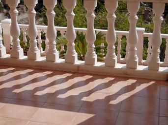 Keywords: balustrade spindles shadow pattern row terrace sunny railing column balcony architectural exterior structure decorative ornate tiles