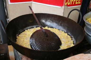 Keywords: banana chips frying deep fried snacks iron pan wok black yellow foods edible junk oily tasty delicious salty crispy crunchy preparation preparing cooking fruits