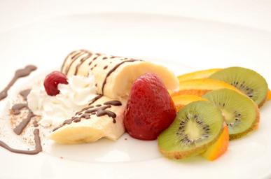 Keywords: bananas strawberries kiwi orange dessert ice cream fruit sweets whipped cream eating sweet dish the sweetness chocolate sweet pastries cocoa tube