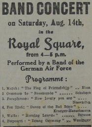 | Keywords: Band concert German Air Force Jersey 1943.jpg Avis Allemand dé duthant l'Otchupâtion d'Jèrri German military decree/notice from Occupation of Jersey PD-GermanGov own photo of old document 2013-04-09 12 37 15 Man vyi 1943 in Jersey Military bands of Germany German military orders in Jersey Royal Square Saint Helier |