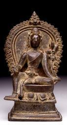 | Keywords: Bangladeshi - Bodhisattva Avalokiteshvara - Walters 543006 - View A.jpg Lightly clad and sparsely ornamented the ascetic bodhisattva is seated in the graceful lalitasana on a lotus with a prominent calyx and broad petals placed atop a plain rectangular base with molding at the bottom His right foot rests laterally on a ledge with beaded edge projecting from the base The slim figure has a long oval face with large staring eyes shaded by peaked brows Long braids of hair frame the face and a fan-shaped crest on top adds a decorative touch His extended right hand holds a jewel and the left grasps a stem carrying a flower with a cluster of leaves probably representing the blue lotus century 9 bronze cm 13 accession number 54 3006 25184 John and Berthe Ford Baltimore date and mode of acquisition unknown Walters Art Museum John Berthe Ford 2002 Desire and Devotion Art from India Nepal and Tibet in the John and Berthe Ford Collection The Walters Art Museum Baltimore; Birmingham Museum of Art Birmingham; Santa Barbara Museum of Art Santa Barbara; Albuquerque Museum Albuquerque 2001-2003 place of origin Bangladesh Walters Art Museum license Buddhist art in the Walters Art Museum Art of Bangladesh Media contributed by the Walters Art Museum needs category review Braids in art Bodhisattva statues |