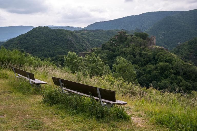 Keywords: bank castle castle are ahr valley burgruine ruin forest ahr germany outlook sachsen eifel view rest break click wanderer vision hiking seat panorama rest pause sit recovery sky clouds mood mountains highlands